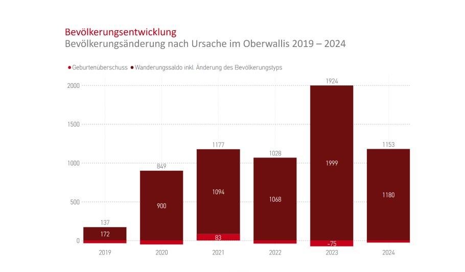 Nimmt man diese Zuwanderung im Oberwallis genauer unter die Lupe, zeigt sich folgendes Bild: Von den insgesamt 7’900 Zugezogenen in den Oberwalliser Gemeinden im Jahr 2024 fielen jeweils rund 3’000 Bewegungen auf Einwanderungen aus dem Ausland, 1’200 auf Zuwanderungen aus anderen Kantonen und 3’700 auf Verschiebungen innerhalb des Kantons. Im selben Jahr zogen demgegenüber rund 6’700 weg. Der Grossteil der Weggezogenen blieb innerhalb des Wallis, also wechselte den Wohnort in eine andere Gemeinde (3’500 Personen). Damit lag der Wanderungssaldo 2024 bei einem Plus von knapp 1’200 Personen (2023: 2’000 Personen). Zum Vergleich: Das entspricht in etwa der Bevölkerungszahl der Gemeinde Goms.