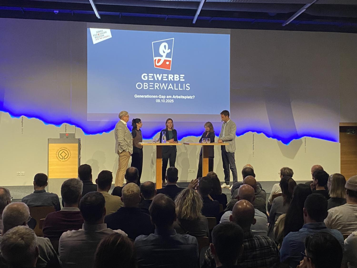 Durch ihr Impulsreferat lieferte Sarah Bütikofer, Politologin und Projektpartnerin beim Forschungsinstitut Sotomo, einen aufschlussreichen Einstieg in die Thematik. Sie präsentierte Zahlen und Fakten, ging auf ihre Bedeutung für die Betriebe ein und gab Tipps und Tricks für den Umgang am Arbeitsplatz. Im anschliessenden Podiumsgespräch, an dem neben Sarah Bütikofer auch José Anita Piening von der MGBahn, Norbert Rittiner von Aletsch Elektro und Social-Media-Managerin Ylenia Zenhäusern als Vertreterin der jungen Generation teilnahmen, wurden weitere Erfahrungen rund um Generationenkonflikte aufgezeigt und besprochen.